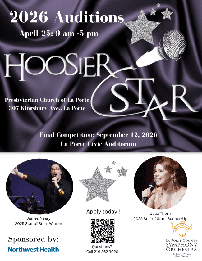 The La Porte County Symphony Orchestra announces auditions for the 21st and final Hoosier Star vocal competition and concert. La Porte, February 13, 2026 - The La Porte County Symphony Orchestra is pleased to announce open auditions for the Grand Finale Hoosier Star vocal competition. Auditions will be held on Saturday, April 25 from 9 to 5 pm CDT at the