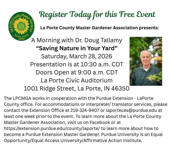 La Porte County Master Gardener EVENT on Saturday March 28th at the La Porte Civic Auditorium. See Attached Flyers for more information. Call 219-324-9807 for more information. LIKE THEM on FACEBOOK Master Gardeners La Porte County Extension. For more information visit their website at www.lpmastergardener.org.