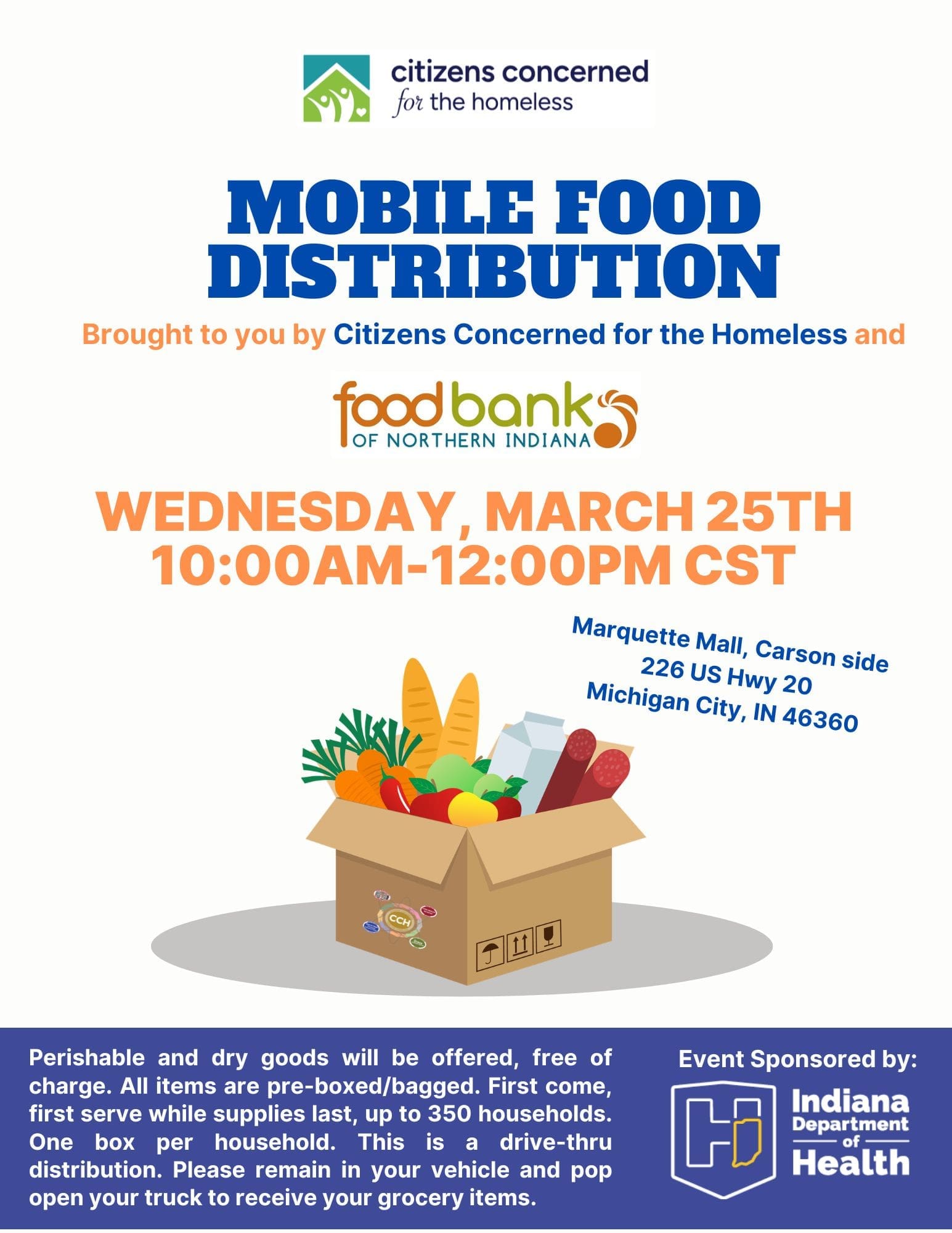 MOBILE FOOD DISTIBUTION WEDNESDAY 3/25/26 at The Marquette Mall in Michigan City on Wednesday 10am-NOON. Check out the flyer attached for more information. #makingadifference #wims #michigancity