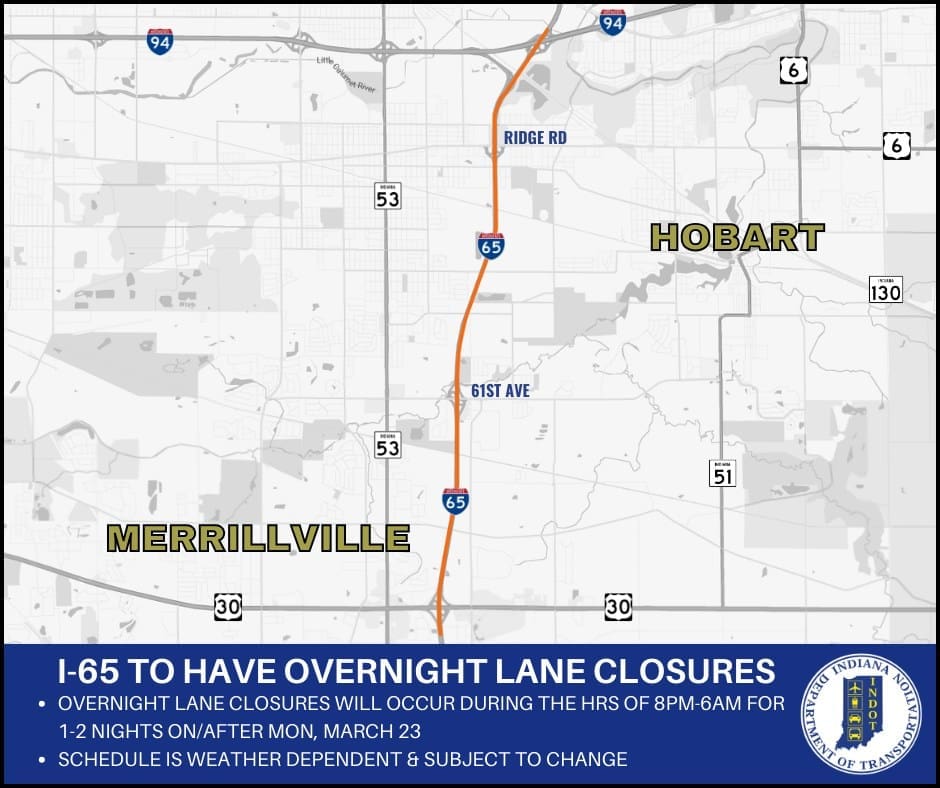 I-65 will have overnight lane closures for 1-2 nights during the hours of 8pm-6am starting on/after tonight, March 23. These lane closures are for pavement markings. INDOT says this work is weather sensitive so the schedule is subject to change.