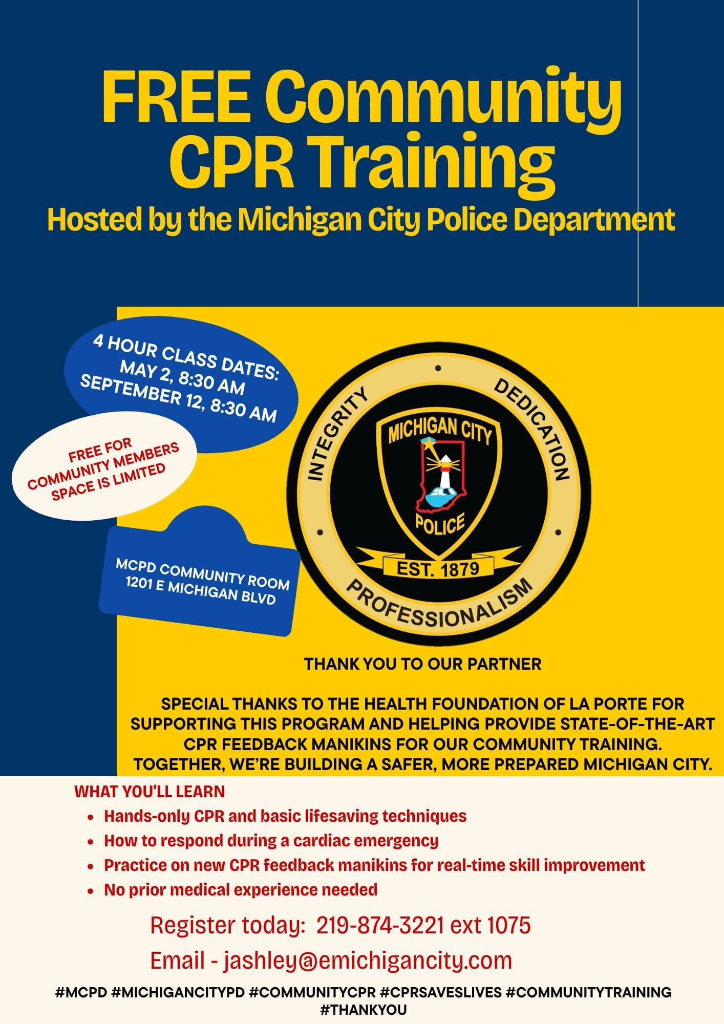 The Michigan City Police Department is offering two free Community CPR Training classes this year to help residents gain lifesaving skills on Saturday, May 2 and Saturday, Sept. 12. These classes will take place from 8:30 AM – 12:30 p.m. at the MCPD Community Room. The classes provide hands-on training that can prepare you to respond during a cardiac emergency