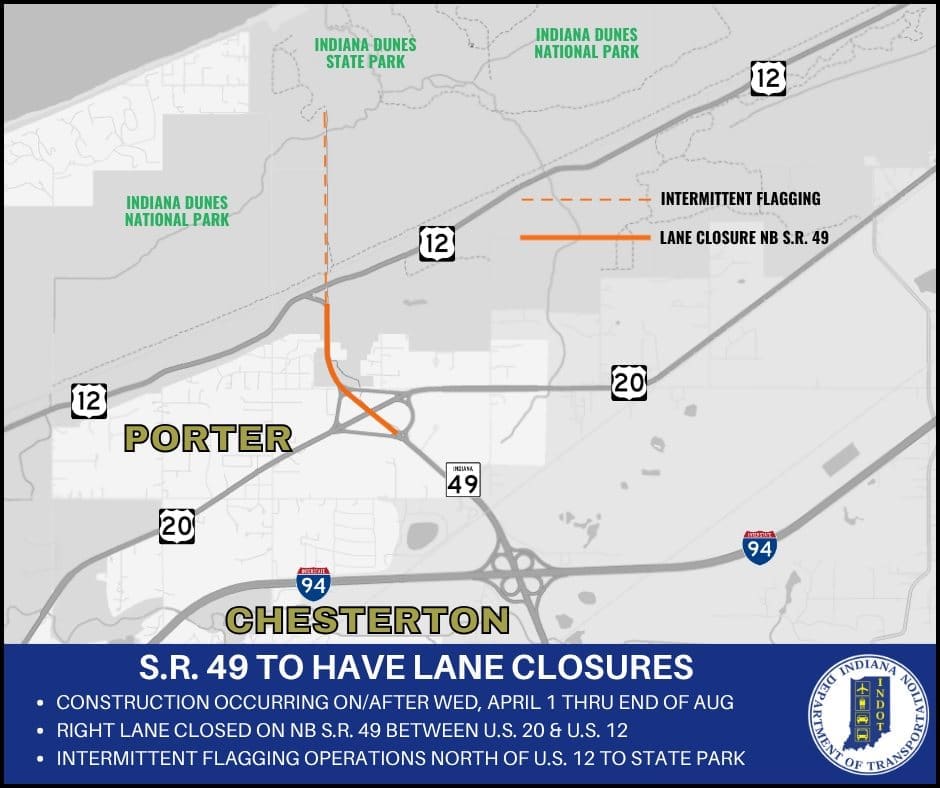 State Road 49 will have traffic restrictions north of U.S. 20 to the Indiana Dunes State Park entrance beginning on or after Wednesday, April 1. The right lane of northbound State Road 49 will be closed at the U.S. 20 bridge north to U.S. 12. This closure is for overhead signage installation. Once installed, overhead signage will better direct motorists