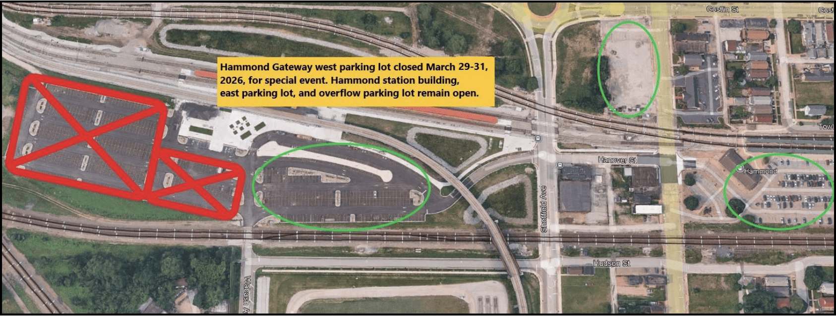 Passengers are advised that the western parking lot at Hammond Gateway will be closed for a special event Sunday, March 29, through Tuesday, March 31, 2026. Between March 29-31, passengers should utilize the Hammond Gateway eastern parking lot or additional overflow lots. All other parking in the Hammond Gateway western lot will be prohibited during this time, and vehicles remaining