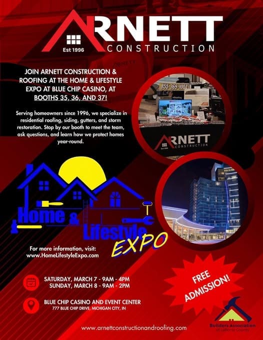Builders Assn of LaPorte County B.A.L.C EVENT this weekend at Blue Chip Casino Hotel Spa in Michigan City. Stop by this FREE, FAMILY Friendly Event Saturday 3/7 and Sunday 3/8. Join a list of wonderful vendors including Arnett Construction & Roofing -TEAM WIMS LIVE Saturday 3/7 between 9a-11a Arnett Construction & Roofing will be part of the upcoming Home &