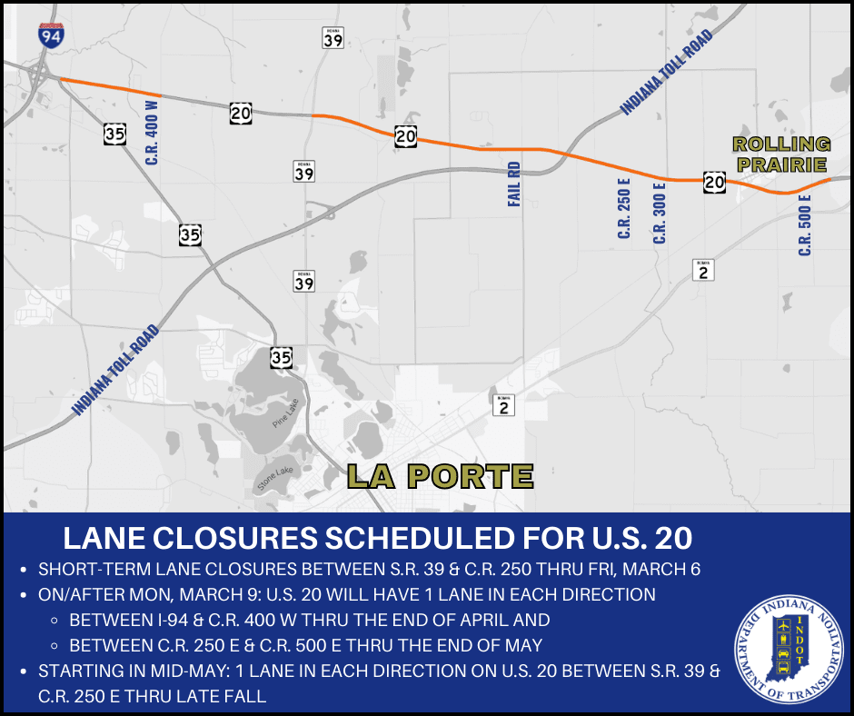 LA PORTE COUNTY, Ind. - Indiana Department of Transportation contractor Rieth-Riley Construction will resume auxiliary two-way left turn lane construction on U.S. 20 between I-94 and State Road 2 on or after Monday, March 9. Tree clearing activities are currently being conducted between State Road 39 and C.R. 250 E with intermittent lane closures in the area through Friday,