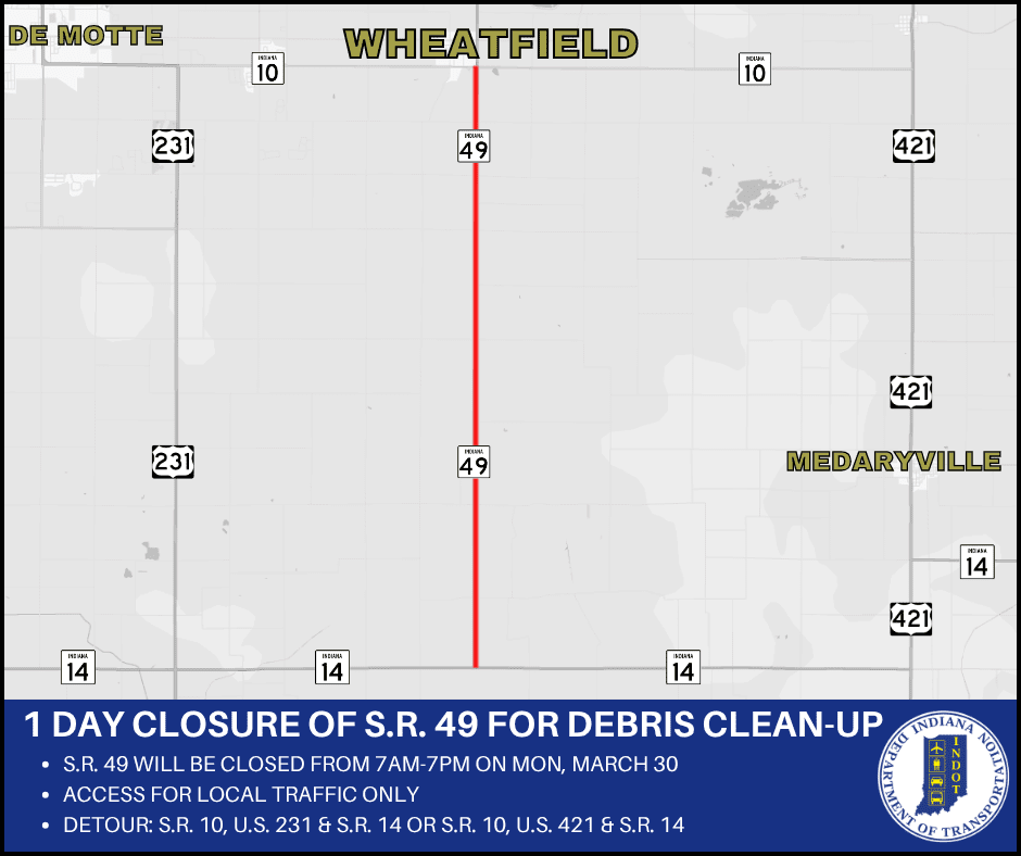 INDOT crews to close S.R. 49 on Monday, March 30 to clear storm debris JASPER COUNTY, Ind. - Indiana Department of Transportation maintenance crews will close State Road 49 between State Road 10 and State Road 14 on Monday, March 30 around 7 a.m. local time. The road is expected to be closed for approximately 12 hours while INDOT crews