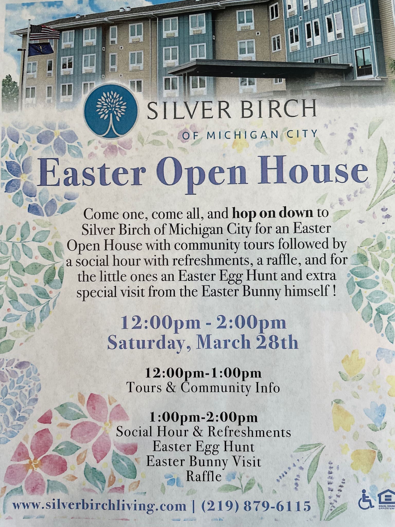 Come visit Silver Birch of Michigan City for their beautiful community and meet the Easter Bunny! March 28th from 12-1 community tours and info 1-2 Easter egg hunt and social hour!