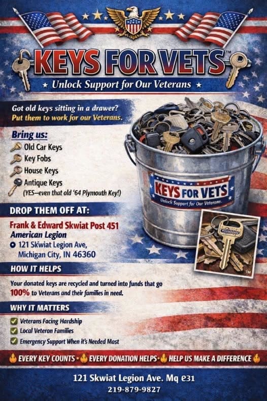 Frank & Edward Skwiat Post 451 Launches “Keys for Vets™” Initiative to Support Local Veterans Michigan City, IN — Frank & Edward Skwiat Post 451 of the American Legion proudly announces the launch of “Keys for Vets™,” a new community-driven fundraising initiative aimed at supporting veterans and their families in need. The program invites community members to donate old and