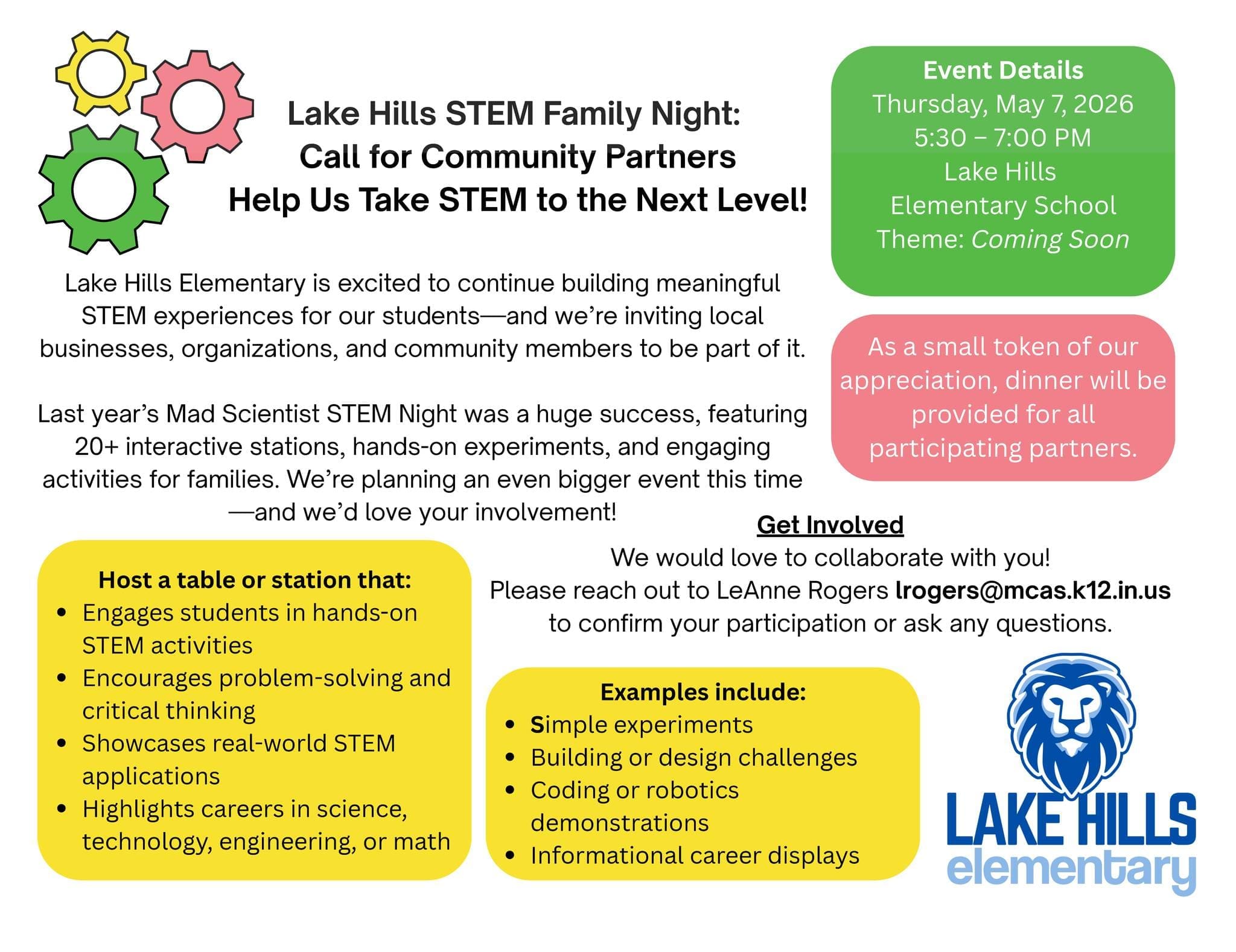 Lake Hills Elementary in Michigan City is inviting local businesses and organizations to host a free, interactive table at STEM Family Night on May 7 from 5:30 to 7:00 p.m. “We are looking for local businesses, organizations, and community members to host a free, interactive table at our STEM Family Night on Thursday, May 7, from 5:30 to 7:00 p.m.