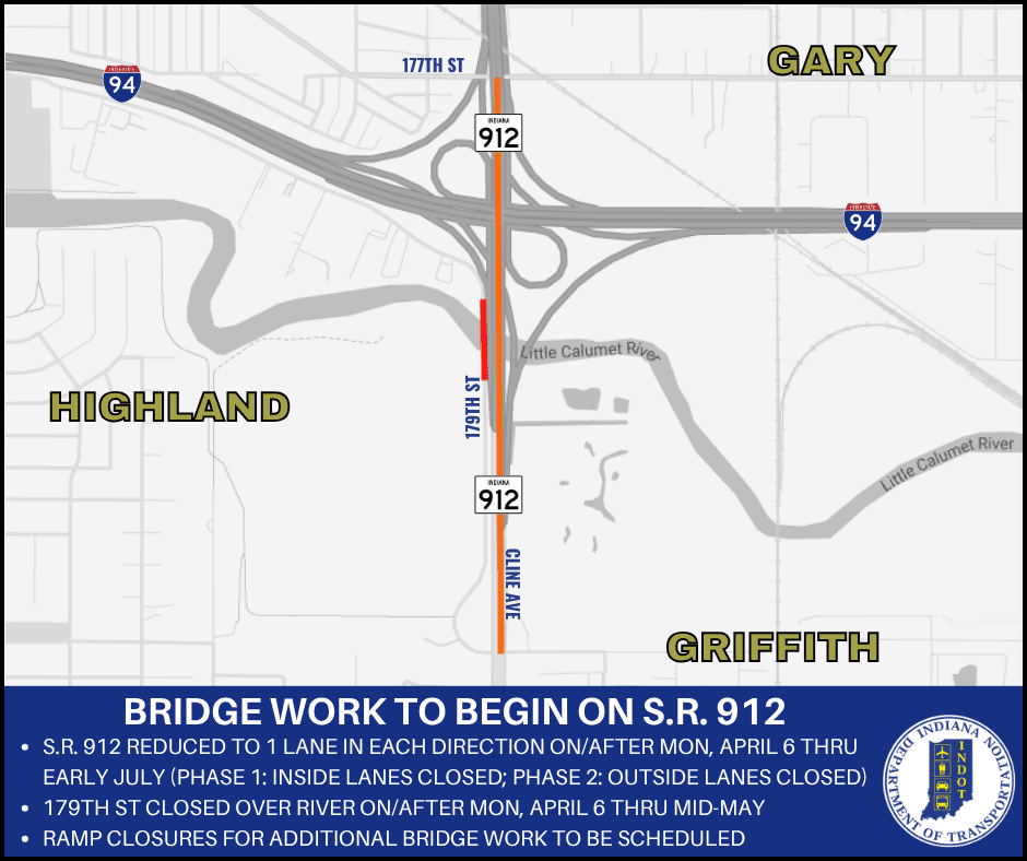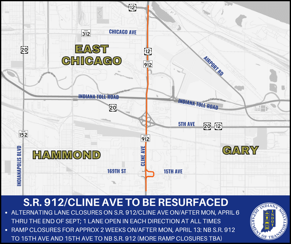 In Lake County, there will be lane closures on State Road 912/Cline Avenue between U.S. 12 and south of 15th Avenue beginning on or after Monday, April 6. State Road 912 will be resurfaced through this area, as well as the on and off ramps at 169th/15th Avenue, U.S.12/20/5th Avenue and U.S. 20/Michigan Street, Gary Road, State Road 312/Chicago Avenue,