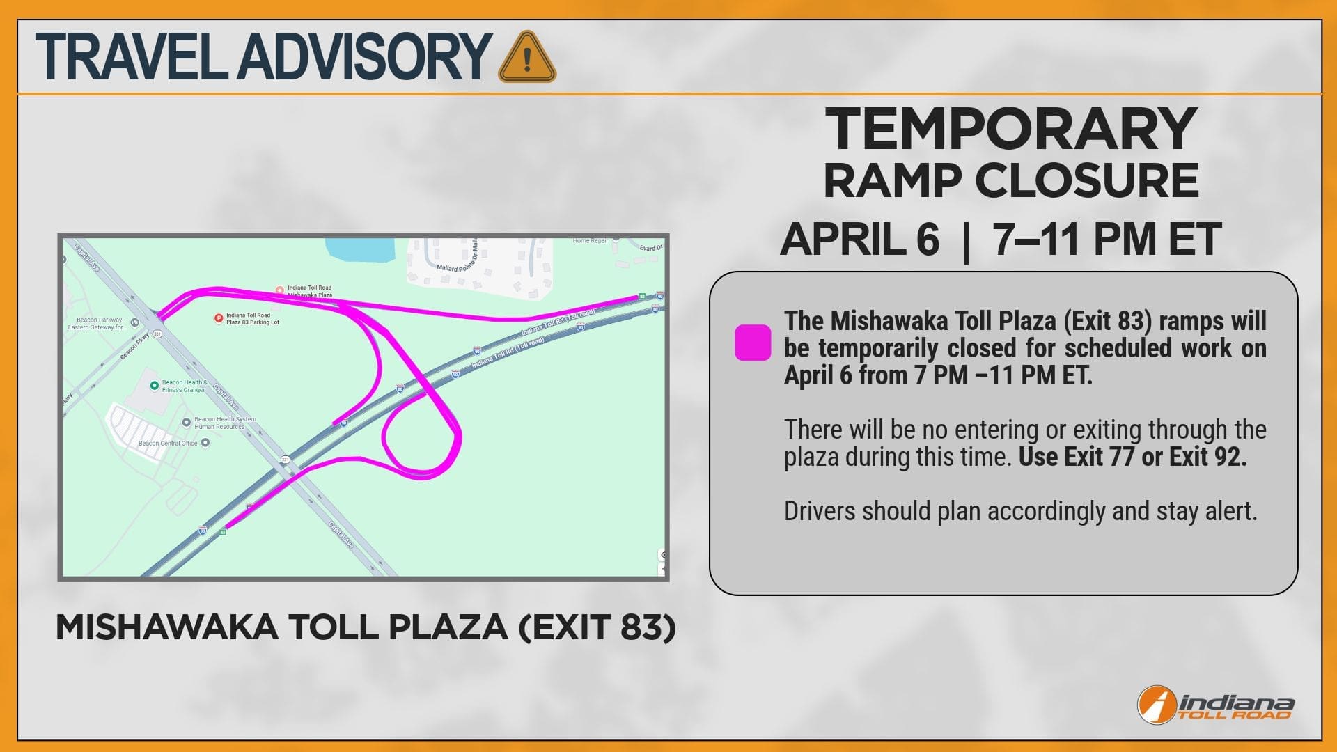 On April 6, from 7:00–11:00 pm ET (6:00–10:00 pm CT), The Indiana Toll Road will be performing scheduled work at the Mishawaka Toll Plaza (Exit 83). During this time there will be no entering or exiting through the plaza. The Indiana Toll Road says to please plan to use Exit 77 or Exit 92.