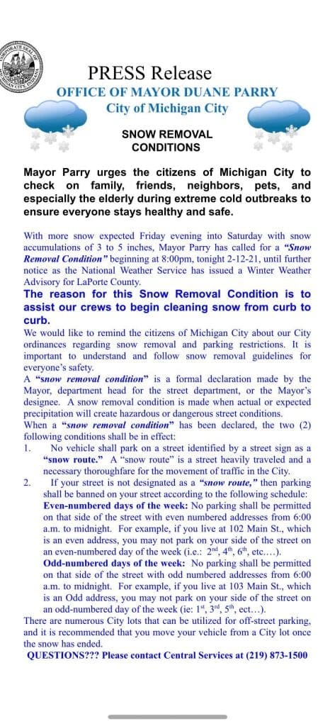 With more snow expected Friday evening into Saturday with snow accumulations of 3 to 5 inches, Mayor Parry has called for a “Snow Removal Condition” beginning at 8:00pm, tonight 2-12-21, until further notice as the National Weather Service has issued a Winter Weather Advisory for LaPorte County.