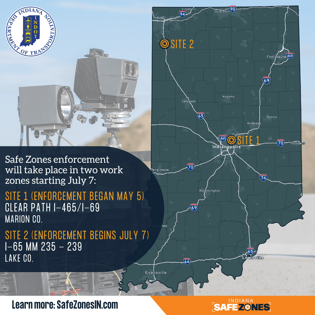 LAKE COUNTY, Ind. – On or after Monday, July 7, enforcement of Indiana’s worksite speed control pilot program, known as Safe Zones , will begin in the I-65 work zone between State Road 2 and State Road 10 (mile marker 235-239). Enforcement will also continue in the Clear Path I-465/I-69 construction zone on the northeast side of Indianapolis.