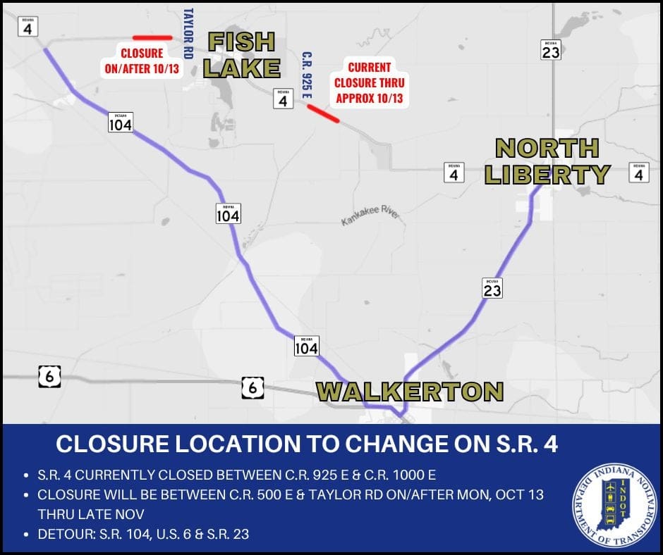 This location will reopen on or around Monday, Oct. 13, and then State Road 4 will be closed between C.R. 500 E and Taylor Road through late November for a bridge deck overlay at the Little Kankakee River.