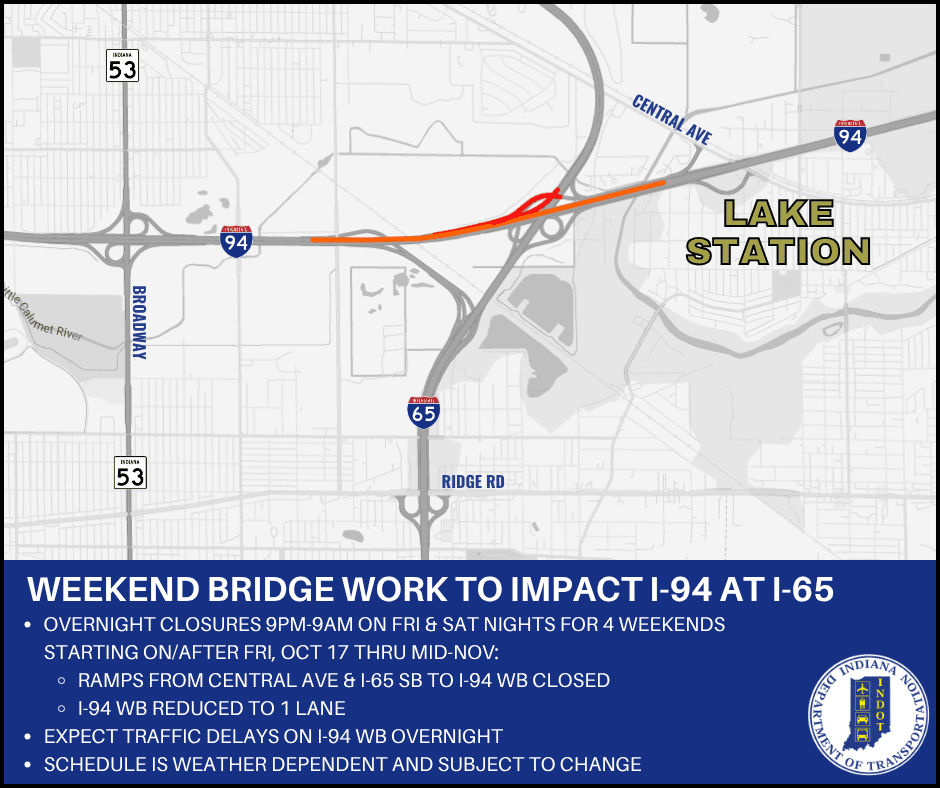 LAKE COUNTY, Ind. – Indiana Department of Transportation contractor Superior Construction Co Inc will have overnight lane and ramp closures on I-94 westbound at the I-65 interchange for four weekends beginning on or after Friday, October 17.