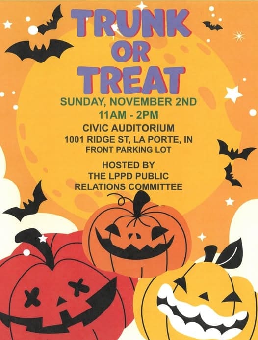 Make plans to bring your family to the FREE Trunk or Treat from 11 a.m.-2 p.m. Sunday, November 2, at the Civic Auditorium parking lot, hosted by the The City of La Porte Police Department Public Relations Committee. #Halloween #LaPorteProud