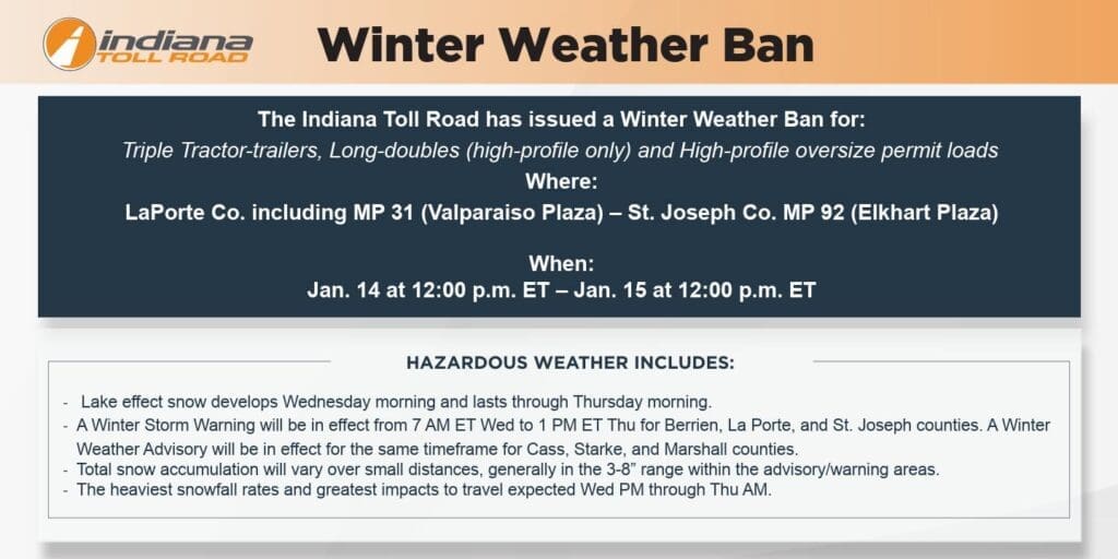 The Indiana Toll Road issued a Winter Weather Ban statement on their social media. Specific details can be found on the graphic below: