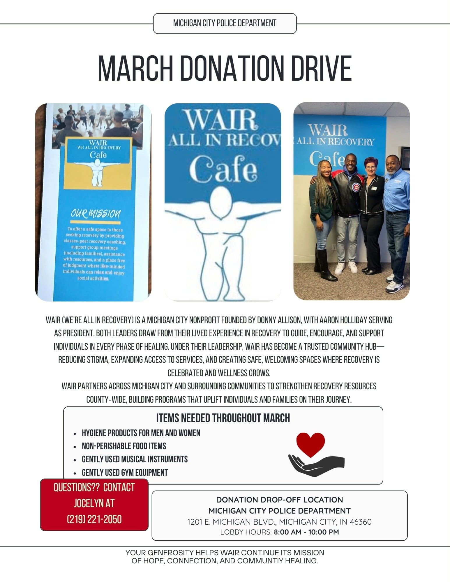 The Michigan City Police Department is partnering with We All In Recovery (WAIR) for our “March Toward Recovery” Donation Drive throughout the entire month of March. WAIR provides a safe and supportive space for individuals on their recovery journey. Their mission is built on connection, encouragement, and community. We are collecting donations all month long to help support the incredible work they are doing in our community. If you’re able, please consider donating items from the list below and dropping them off at the police department.