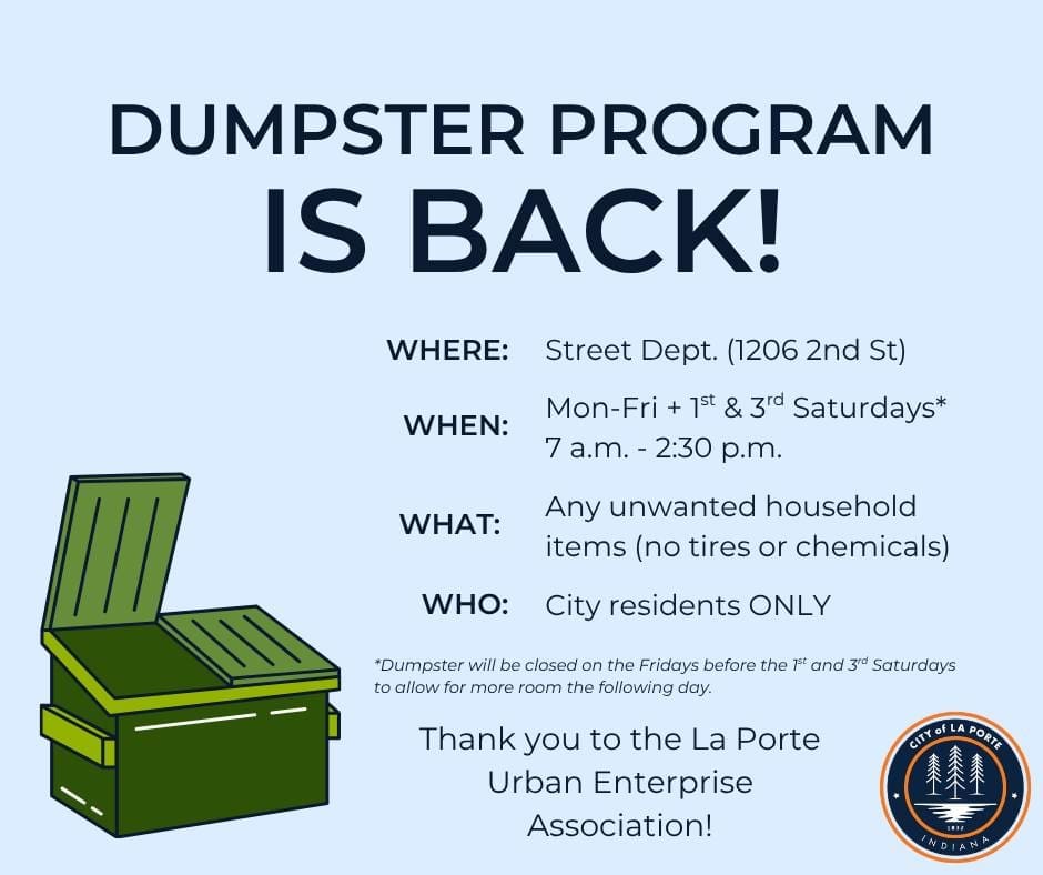 The City of La Porte announced the Dumpster Program has returned for its fifth season.