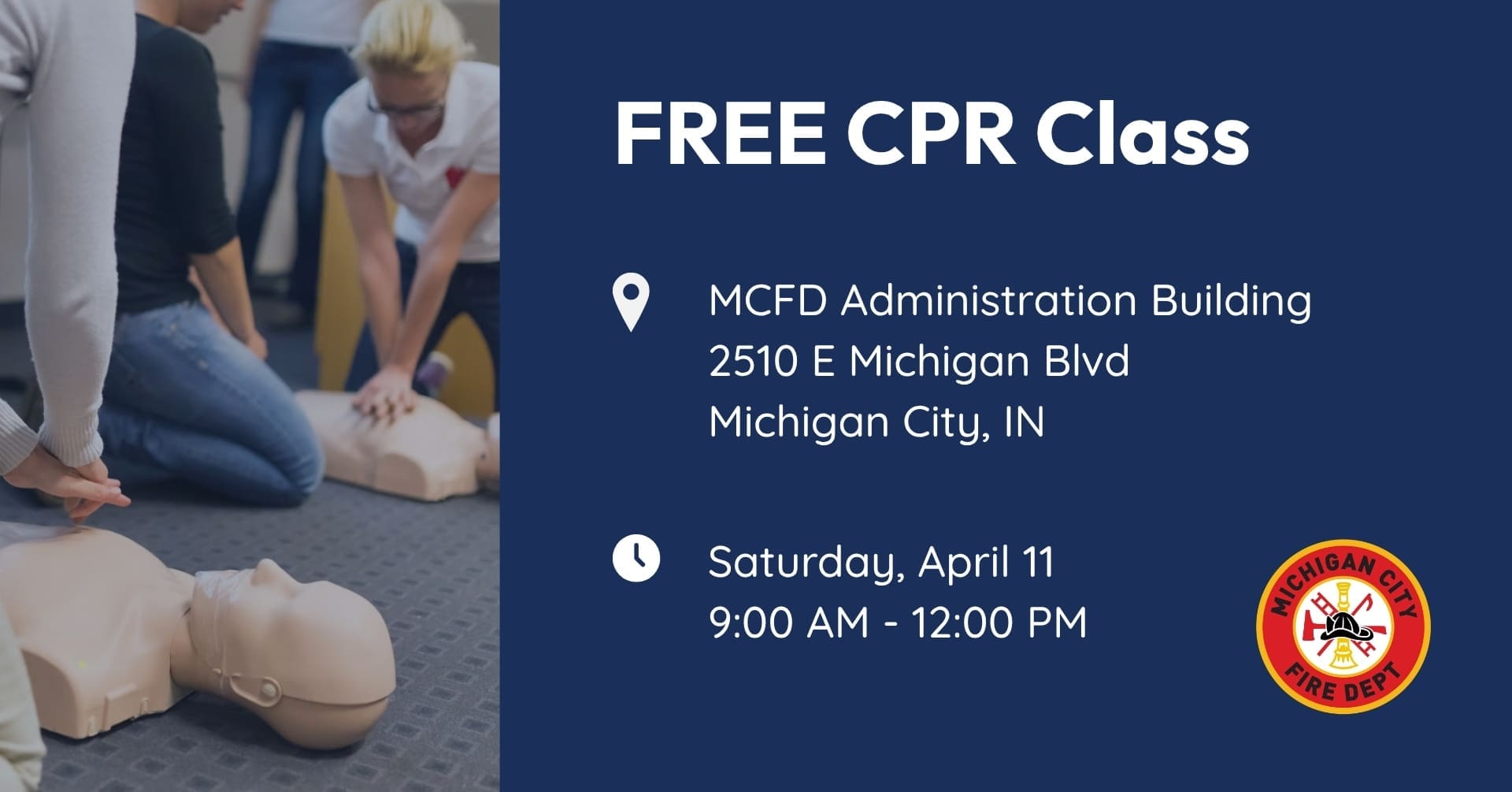 The La Porte County Health Department announced earlier in the week that the Michigan City Fire Department will host a free CPR class this Saturday, April 11.