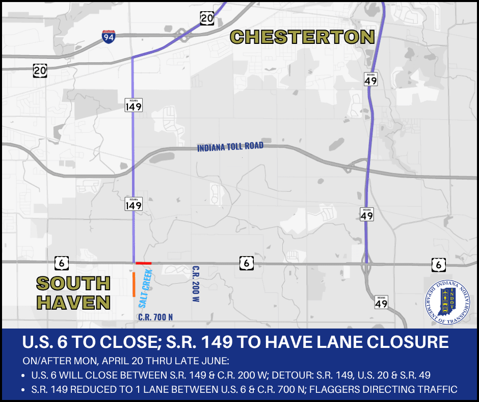 U.S. 6 will close between State Road 149 and C.R. 200 W for a bridge deck overlay preventative maintenance project at Salt Creek. Motorists should seek alternate routes. The official detour will follow State Road 149, U.S. 20 and State Road 49.