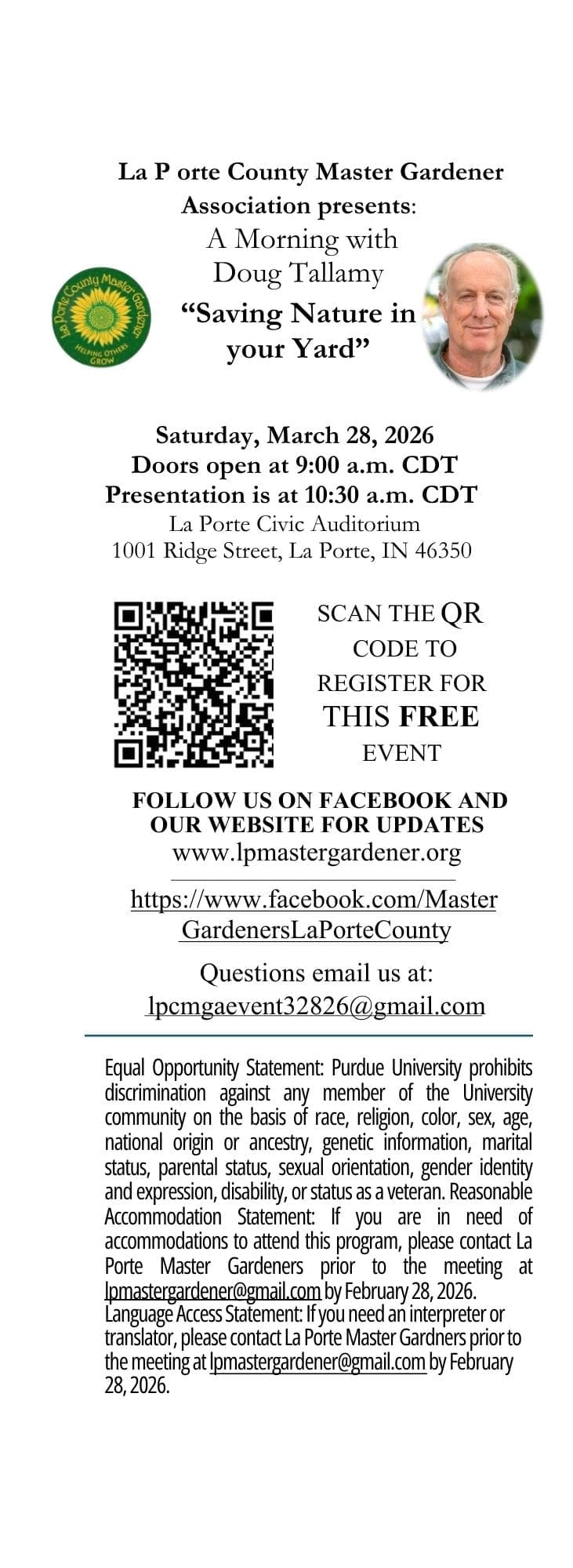 La Porte County Master Gardener EVENT on Saturday March 28th at the La Porte Civic Auditorium. See Attached Flyers for more information. Call 219-324-9807 for more information. LIKE THEM on FACEBOOK Master Gardeners La Porte County Extension. Visit their website at www.lpmastergardener.org.
