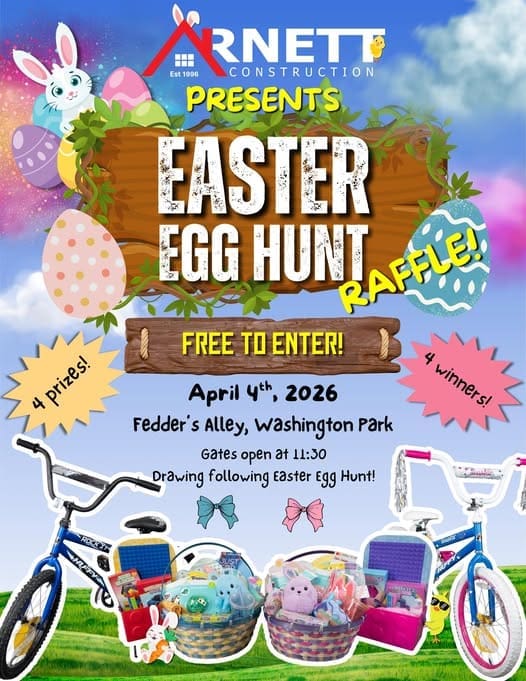 Michigan City Special Events East Egg Hunt on Saturday April 4 in Fedder’s Alley in Washington Park. Gates Open at 11:30am. Easter Egg Hunt starts at NOON. Plus, Arnett Construction & Roofing has an Easter Egg Hunt Drawing right after the Easter Egg Hunt. 4 Prizes. 4 Winners.