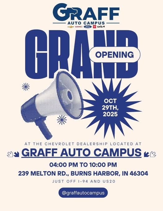 Join us for our Grand Opening of the Graff Auto Campus on October 29th. We will be having a Trunk or Treat with local organization participants, events, prizes, giveaways, music, food, and fun games for the whole family! #GraffAutoCampus #grandopening #alwaysgraff #alwaysfun #grandopeningcelebration Please share and RSVP here: https://www.facebook.com/share/179Rj1ReWV/ Come join us at the Grand Opening Ribbon Cutting Ceremony starting at the Graff Chevrolet GMC of Michigan City on US421. We will then be holding the Trunk or Treat festivities afterward at the Graff Chevrolet of Chesterton on US20, both right off I-94. #GraffAutoCampus #michigancityindiana #grandopeningcelebration