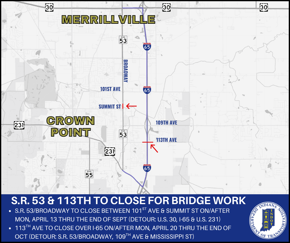 In Lake County, the Indiana Department of Transportation announced two road closures for bridge work in Crown Point, urging motorists to plan ahead due to work already occurring in the area. Rieth-Riley Construction Co Inc will close State Road 53/Broadway between 101st Ave and Summit St on or after Monday, April 13 through the end of September for a bridge superstructure replacement project at Main Beaver Dam Ditch. A superstructure replacement includes replacing elements such as the deck and beams while retaining the existing substructure. The official detour will follow U.S. 30, I-65 and U.S. 231. INDOT contractor F H