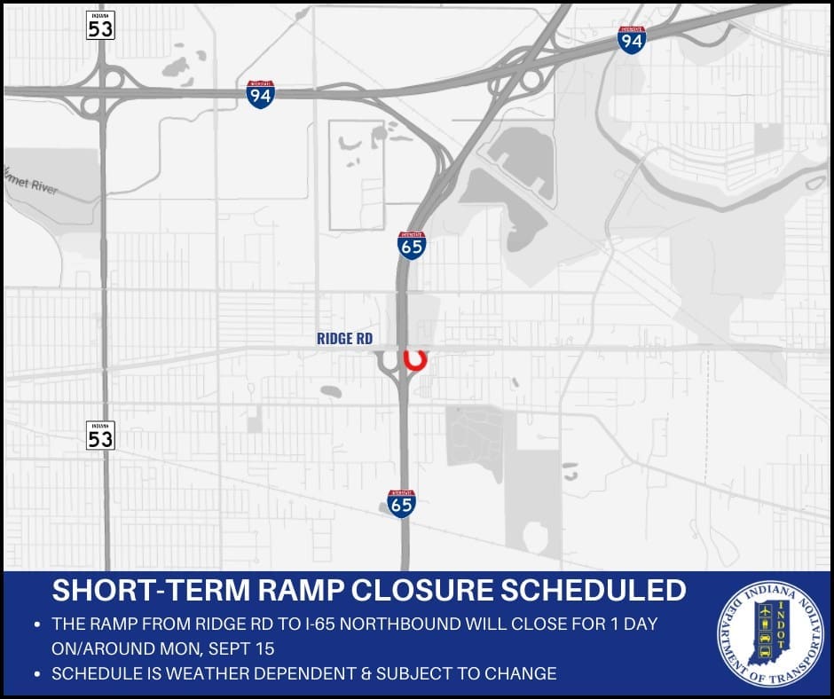 Ramp from Ridge Road to northbound I-65 closed today in Lake County