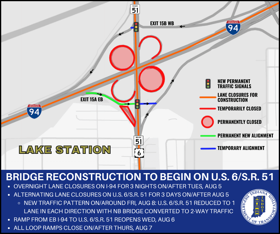 LAKE COUNTY, Ind. - Indiana Department of Transportation contractor F.H. Paschen, S.N. Nielsen & Associates LLC will be moving into bridge demolition and reconstruction of the southbound U.S. 6/State Road 51 bridge over I-94. I-94 eastbound and westbound will have overnight lane closures in this area during the hours of 7 p.m. to 5 a.m. for approximately three nights beginning Tuesday, August 5 to address conflicting overhead signage for the upcoming bridge work at U.S. 6/State Road 51. Additional overnight lane closures will take place Monday, August 11 and Tuesday, August 12. U.S. 6/State Road 51 will have alternating lane