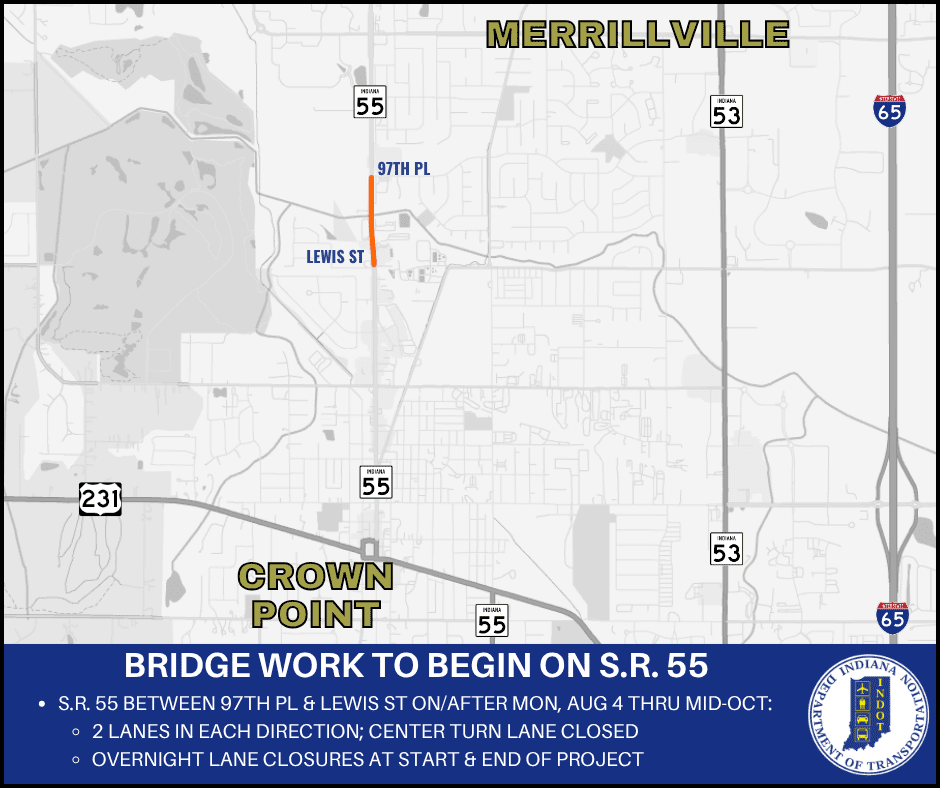 LAKE COUNTY, Ind. - Indiana Department of Transportation contractor Rieth-Riley Construction will have traffic restrictions on State Road 55/Main St between 97th Place and Lewis St beginning on or after Monday, August 4. State Road 55 will maintain two lanes in each direction, but the center turn lane will be closed and southbound traffic will be shifted to the left to make room for the work zone. Overnight lane closures will be utilized at the start of the project to deliver materials and equipment and at the end of the project to remove them. Construction will be ongoing through mid-October