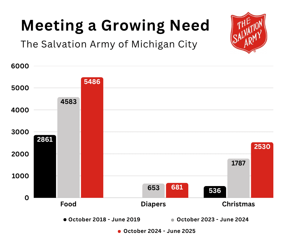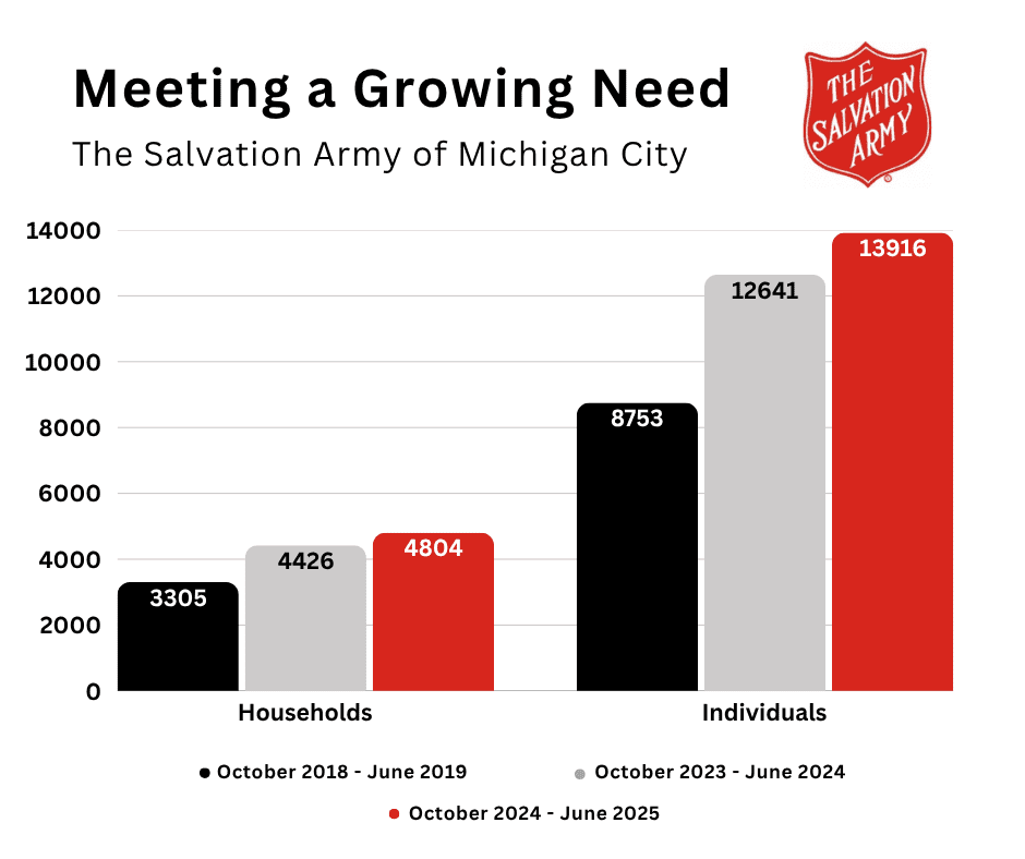 MICHIGAN CITY – The Salvation Army of Michigan City is experiencing a significant increase in demand for service, which has left a shortfall in the budget, so the non-profit organization is turning to the public for help. Affected programs include the food pantry and basic assistance programs as local families continue to face economic challenges. Over the past several years, the number of households served by The Salvation Army of Michigan City has grown dramatically, from approximately 3,300 households in 2018/2019 (Oct. to June) to nearly 4,800 households in 2024/2025 (Oct. to June). The total number of individuals served has